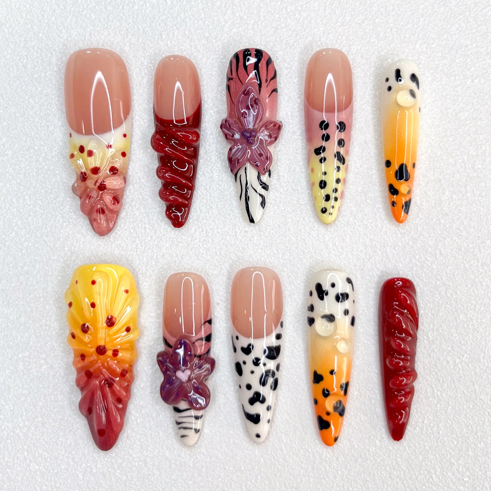 Production:Handmade Press-On Nails – Long Oval Autumn 3D Yellow Orange Flower Polka Dots | CHU-FEN