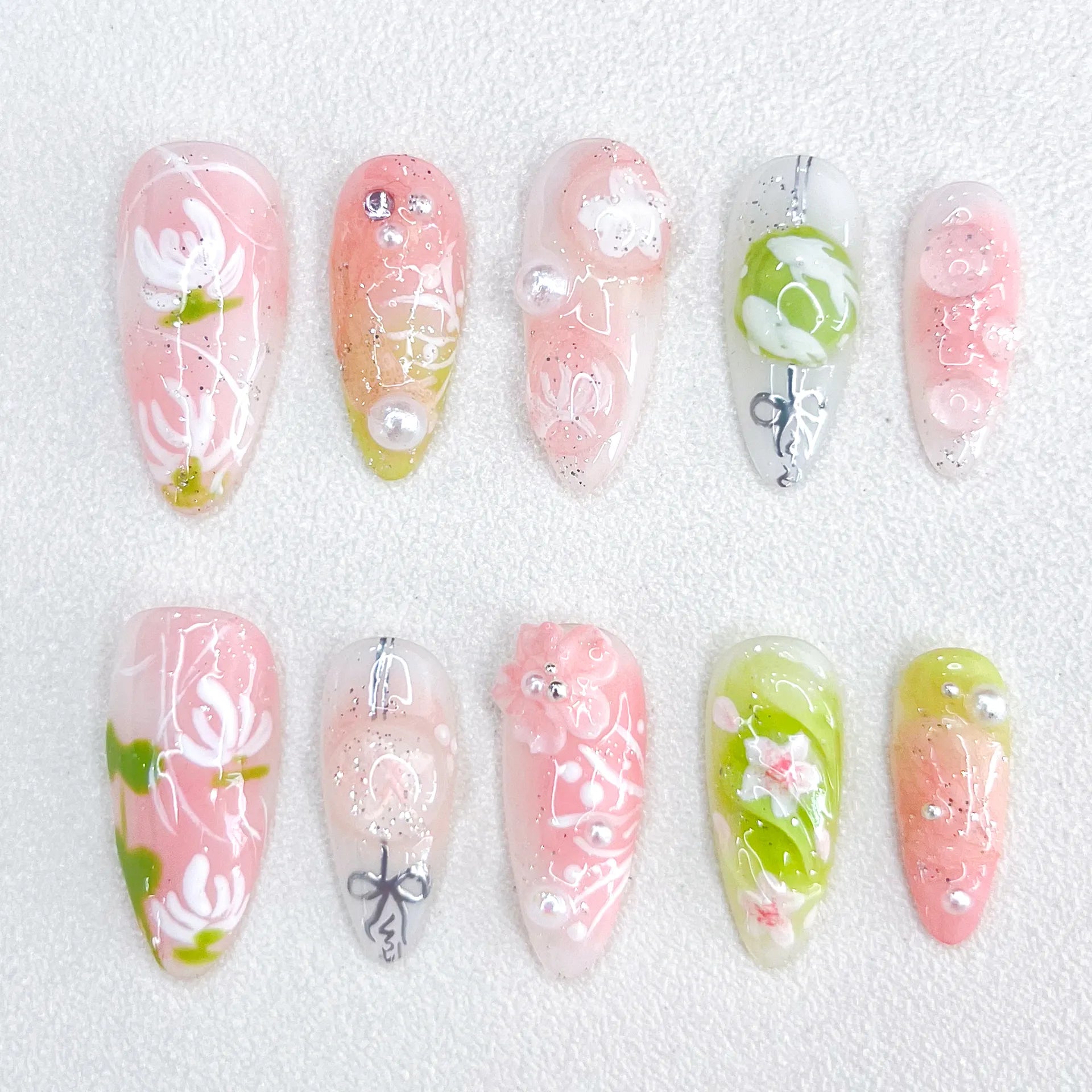 Production:Handmade Press-On Nails – Almond Hand-draw 3D Flower | CHU-FEN