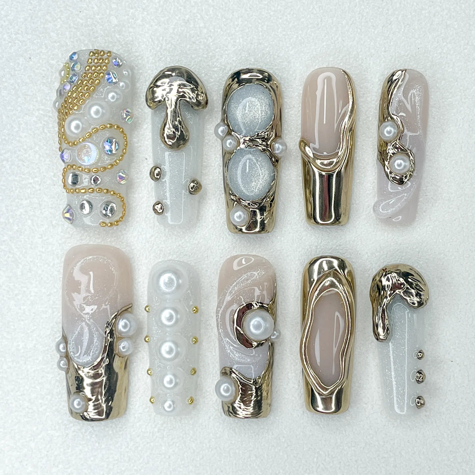 Production:Handmade Press-On Nails – Long Coffin Chrome French 3D Pearl | CHU-FEN