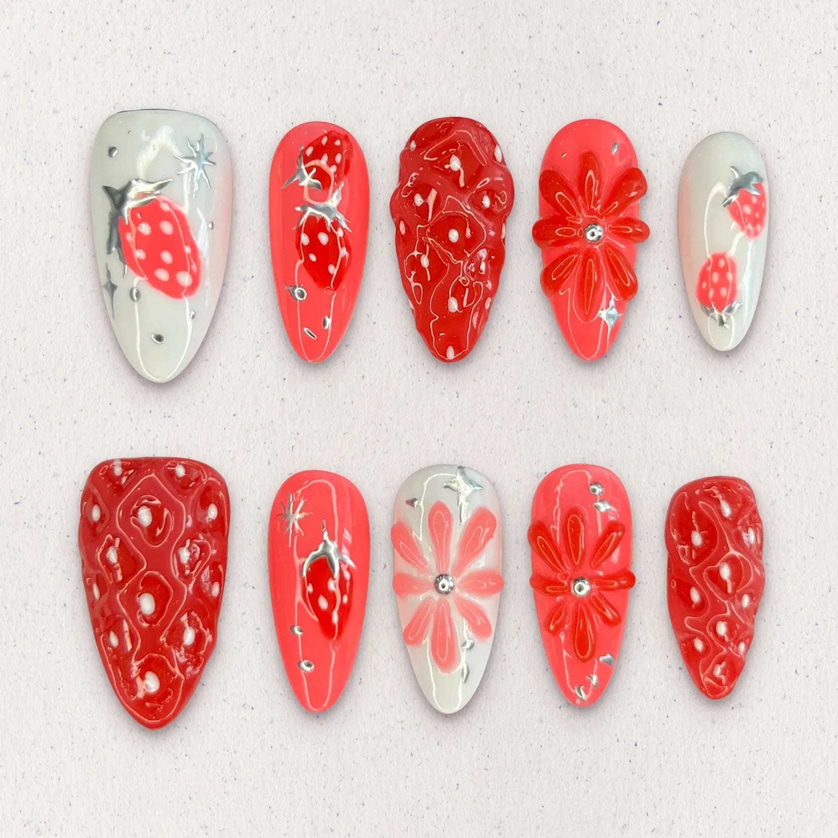 Production:Handmade Press-On Nails – Almond 3D Strawberry Hand-draw Flower | CHU-FEN