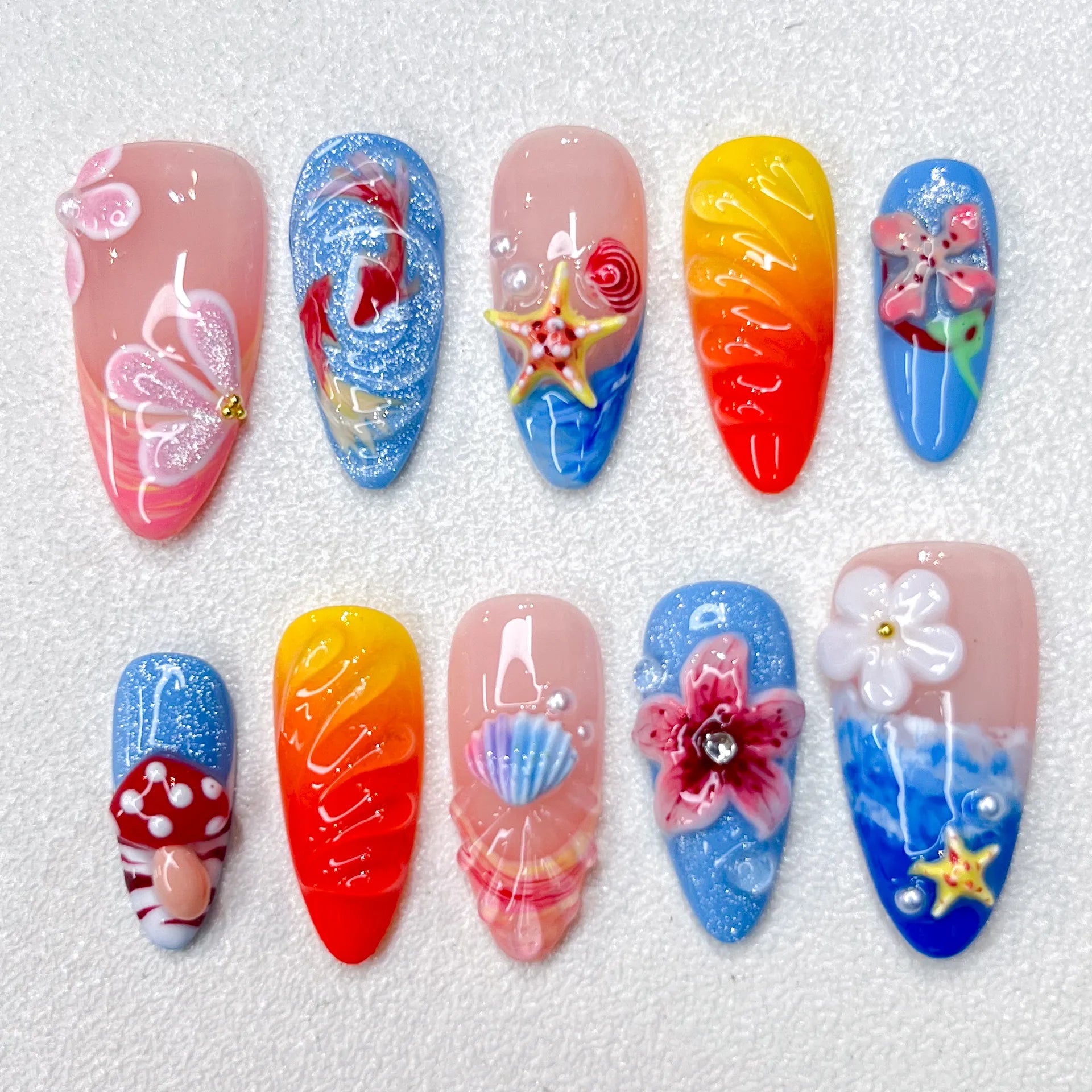 Production:Handmade Press-On Nails – Almond French 3D Color Flower Flow | CHU-FEN